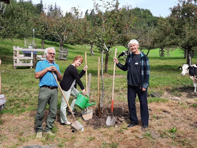 Zum speziellen Abschluss der Generalversammlung kam es draussen. Andrea Bory pflanzte mit zwei ehemaligen Präsidenten, Dr. Hans Thalmann und Hans Jürg Hörler, einen Tricolor-Apfelbaum. Tricolor zum einen symbolisch für die drei Sprachregionen der Schweiz, in denen Agriviva vor allem tätig ist (Deutschschweiz, Westschweiz, Tessin). Zum anderen auch für das längerfristige Bestehen von Agriviva und die Verbindung zwischen den Generationen.