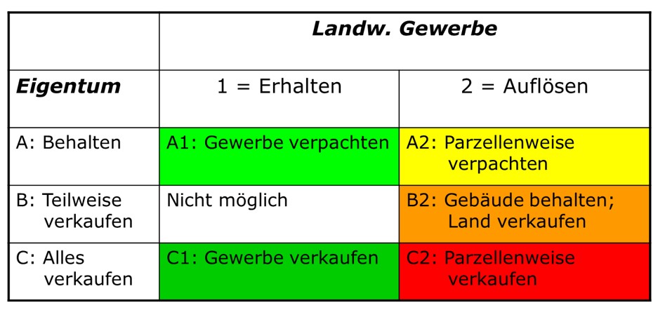 Ein erstes Gespräch verschafft einen klaren Überblick über die familiäre und betriebliche Situation, die Liegenschaften, das Land sowie die Stallungen. Darauf aufbauend werden erste Perspektiven erörtert. Die möglichen Wege werden übersichtlich in der Tabelle «Möglichkeiten Betrieb ohne Nachfolge» dargestellt.
