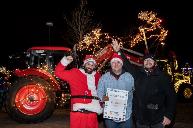 Die 7-köpfige Jury, unter anderem mit Regierungsrat Peter Hodel und dem Direktor des Schweizer Bauernverbands, Martin Rufer, hatte die schwierige Aufgabe, die acht am schönsten geschmückten Fahrzeuge zu prämieren. Sie bewerteten die Traktoren nach folgenden Kriterien: Weihnachtlich, Aufwand, Originalität und Kreativität. Die ersten drei Gewinner sind: 1. Thomas Schneeberger, Welschenrohr; 2. Silas Affolter, Leuzigen und 3. Silvan Flury aus Deitingen. Auf dem Parkplatz der DePuy Synthes konnten die Fahrzeuge nach dem Umzug von nahem bestaunt werden. Zudem gab es dort die Möglichkeit, etwas zu trinken und eine Bratwurst zu essen, was auch rege benutzt wurde. Mitorganisator Markus Dietschi, Selzach, war über den Erfolg des Anlasses sehr erfreut und vor allem auch darüber, dass alles unfallfrei abgelaufen ist. Er dankte am Schluss vor allem allen Landwirtinnen und Landwirten für ihr Mitmachen, für ihre Kreativität und für den grossen Aufwand, den sie für dies auf sich genommen haben.