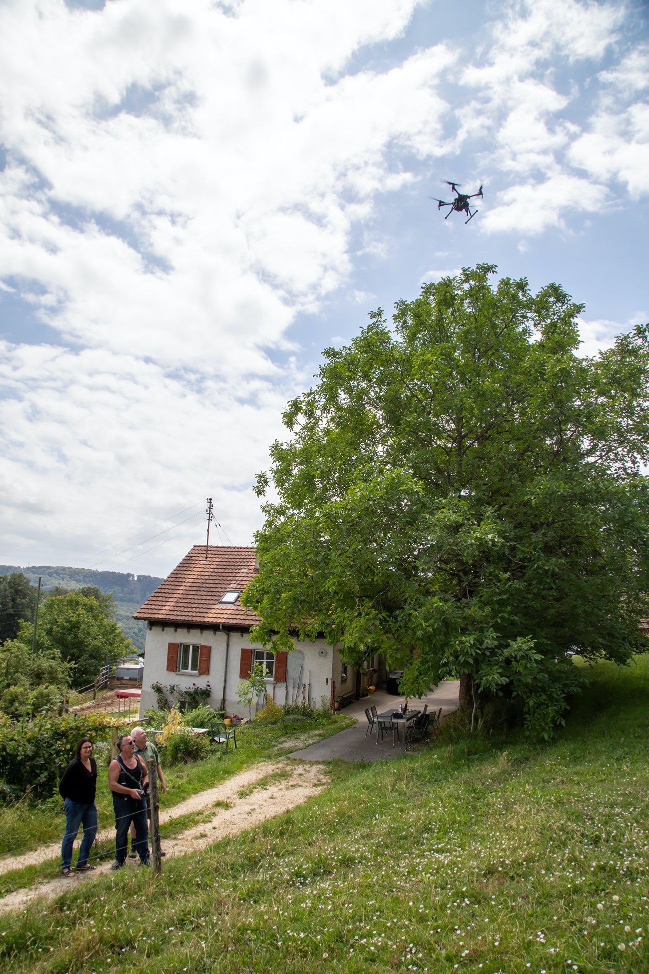 Gestellter Einsatz: Wolfgang Stich steuert die Drohne, Marcel Wyser, Präsident Jagdverein Blauenstein (r.), und Sarah Zuber, Vertreterin des Landwirtschaftlichen Bezirksvereins Thierstein, verfolgen die Szene.