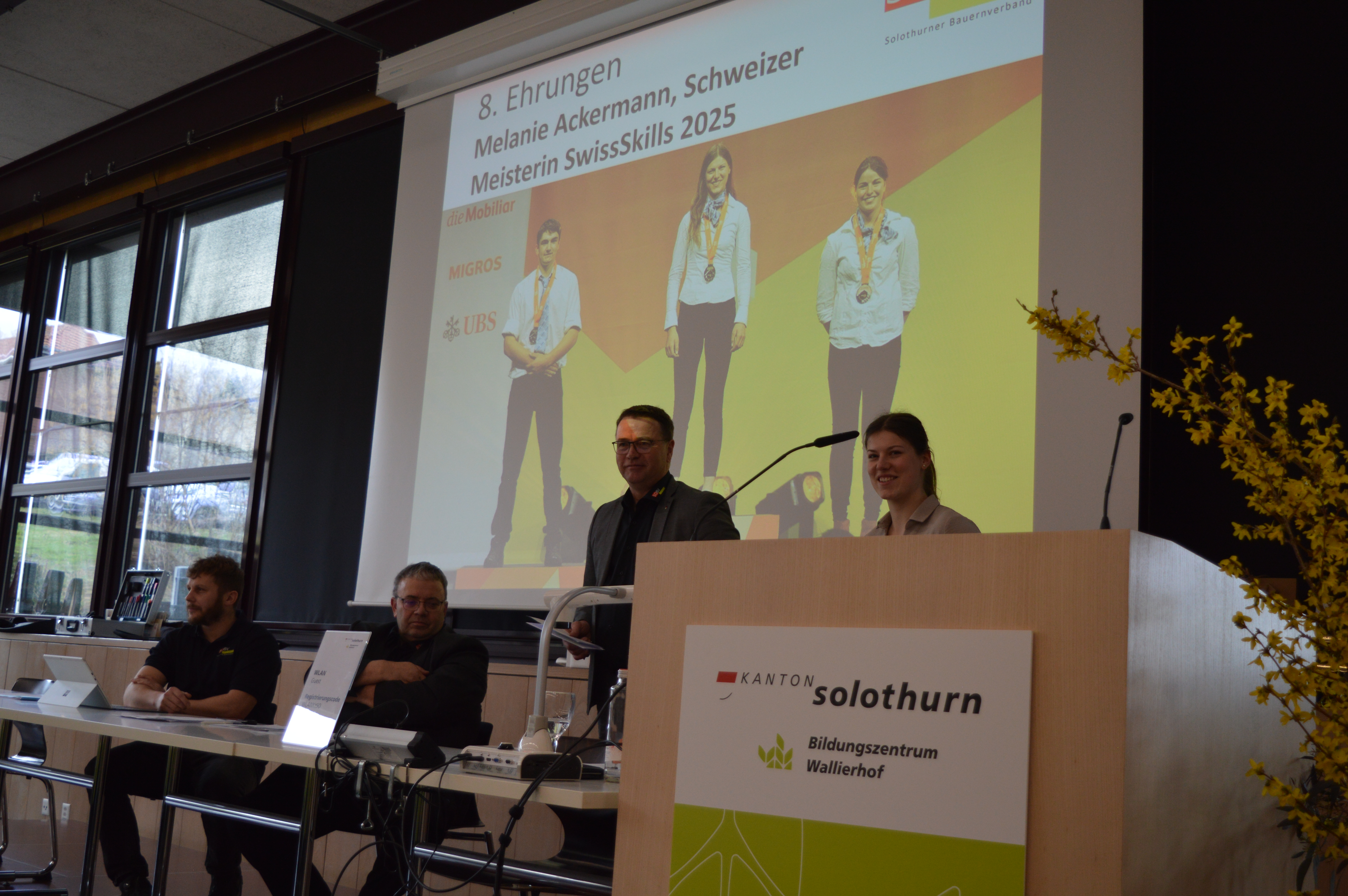 Ein besonderer Programmpunkt war die Ehrung zahlreicher langjähriger Kommissionsmitglieder und Charchierten, die mit ihrem Engagement wesentlich zur Verbandsarbeit beitragen. Speziell geehrt mit grossem Applaus und Standing Ovation wurde zudem Melanie Ackermann, Wolfwil, die an den SwissSkills 2025 den Schweizer Meistertitel im Beruf Landwirt/in EFZ errang. Für ihre herausragende Leistung wurde ihr eine Glocke überreicht. Ackermann äusserte sich auf die Interviewfrage bezüglich ihres Wunsches für die Zukunft, dass die Produktion von Nahrungsmittel im Mittelpunkt stehen soll und diese nicht durch ausufernde Bürokratie und stark einschränkende Gesetz gefährdet werden darf.