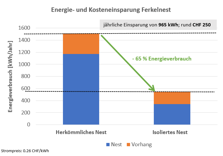 Durch eine temperaturgesteuerte elektrische Heizung, eine gut isolierte Kiste mit isolierten, ferkelgängigen Vorhängen kann der Energieverbrauch bei den Ferkelnestern pro Jahr bis 965 kWh gesenkt werden. Durch die steigenden Energiepreise können aktuell rund CHF 250.00 pro Ferkelnest eingespart werden.