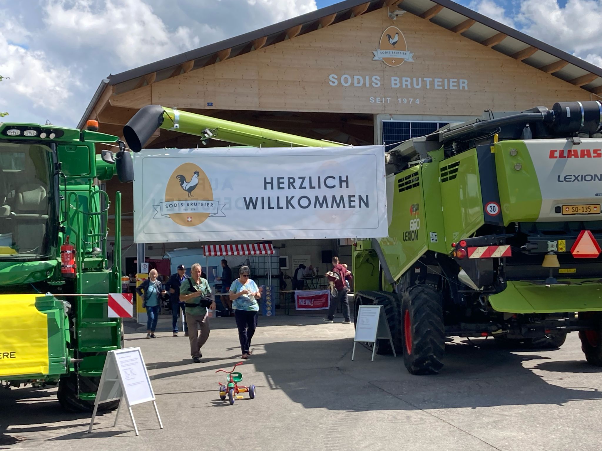 Das Hoffest bei Eberhards stand ganz unter dem Zeichen der Hofvorstellung und des Informationsaustauschs. Der Bevölkerung und den Konsumenten wurde aufgezeigt, wie Bruteier als Grundlage der Pouletfleischproduktion produziert werden und wie wichtig dieser Teil für die Ernährung der Bevölkerung ist. Für die Kleinen war eine Hüpfburg und eine Spielecke organisiert, eine reichhaltige Festwirtschaft verpflegte Gross und Klein und viel Wissenswertes wurde an den vier Hofführungen vermittelt. Adrian und sein Vater Walter Eberhard stellten am Hoffest ihren vielfältigen und innovativen Landwirtschaftsbetrieb in Schnottwil vor. Seit 1974 werden auf dem Familienbetrieb als Hauptbetriebszweig Bruteier hergestellt, welche Küken dann für die Pouletmast in Mastställen in der Region bestimmt sind. In den modernen Ställen werden Hühner und Hähne zusammen gehalten, damit die Eier befruchtet werden. Auf rund 10 Hennen gibt es einen Hahn. Im Durchschnitt resultiert eine Befruchtungsrate der Eier von 87 bis 90%. Die Eier werden dann in die Brüterei Wüthrich AG in Belp geliefert. Dort schlüpfen nach exakt 21 Tage die Küken. Bei den Hühnern handelt es sich um die Rasse «ROOS 308». Dies ist eine Kreuzung des weissen (Eierleistung) und braunen (Wachstum/Robustheit) Huhns. Diese Kreuzung erklärt die beige, braune Farbe der Eier.