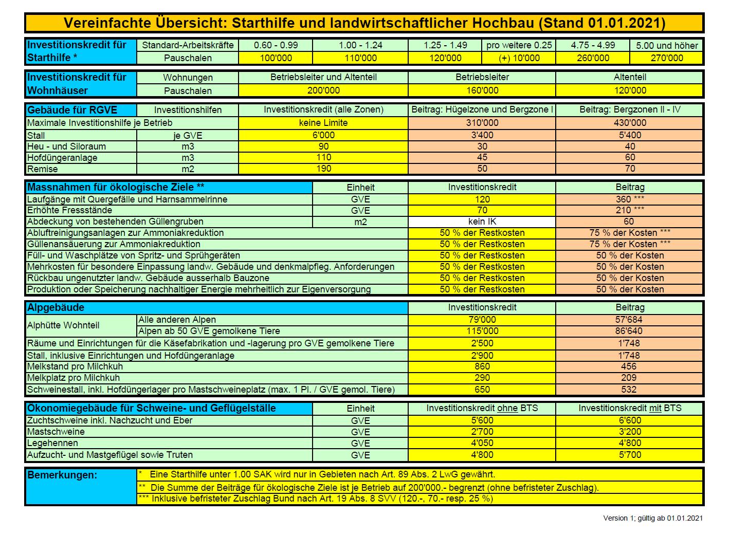 Ökonomiegebäude für Raufutterverzehrer werden neu im Hügel- und Berggebiet mit den gleichen Ansätzen für Investitionskredit unterstützt wie im Talgebiet. Dazu kommen die Strukturverbesserungsbeiträge. Abgeschafft wurde demgegenüber der Sockelbeitrag für den Stallbau. Dieser wurde mit leicht höheren Ansätzen pro GVE korrigiert. Die untenstehende Tabelle gibt eine Übersicht über die geltenden Ansätze für Investitionskredite und Strukturverbesserungsbeiträge: