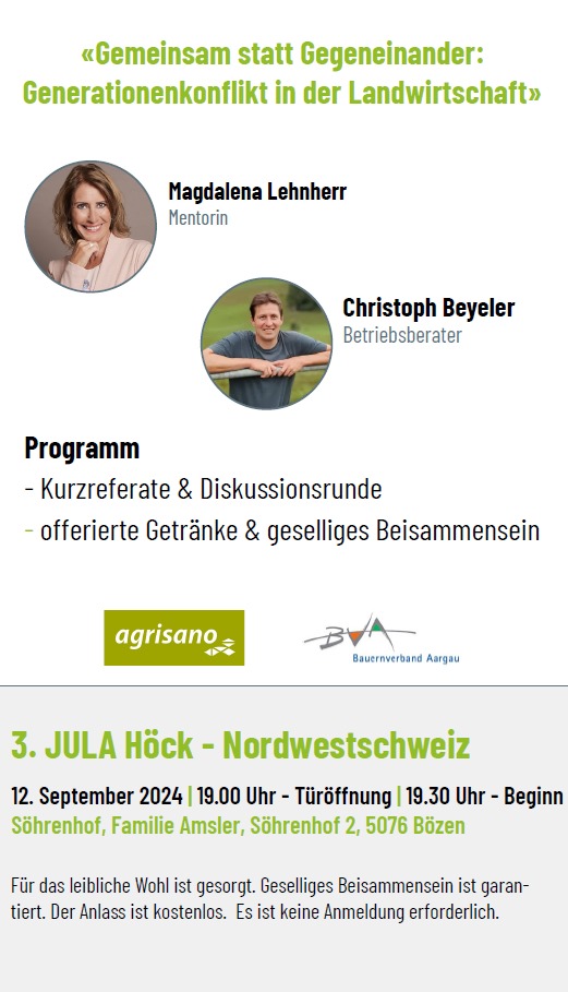 Bei unserem dritten Anlass haben wir uns für das Thema «Gemeinsam statt Gegeneinander – Generationenkonflikt in der Landwirtschaft» entschieden. Ein Thema, mit welchem wohl jede Junglandwirtin und jeder Junglandwirt bereits zu tun hatte und das beschäftigt. Diesen Anlass dürfen wir bei der Familie Amsler auf dem wunderschönen Söhrenhof in Bözen durchführen.