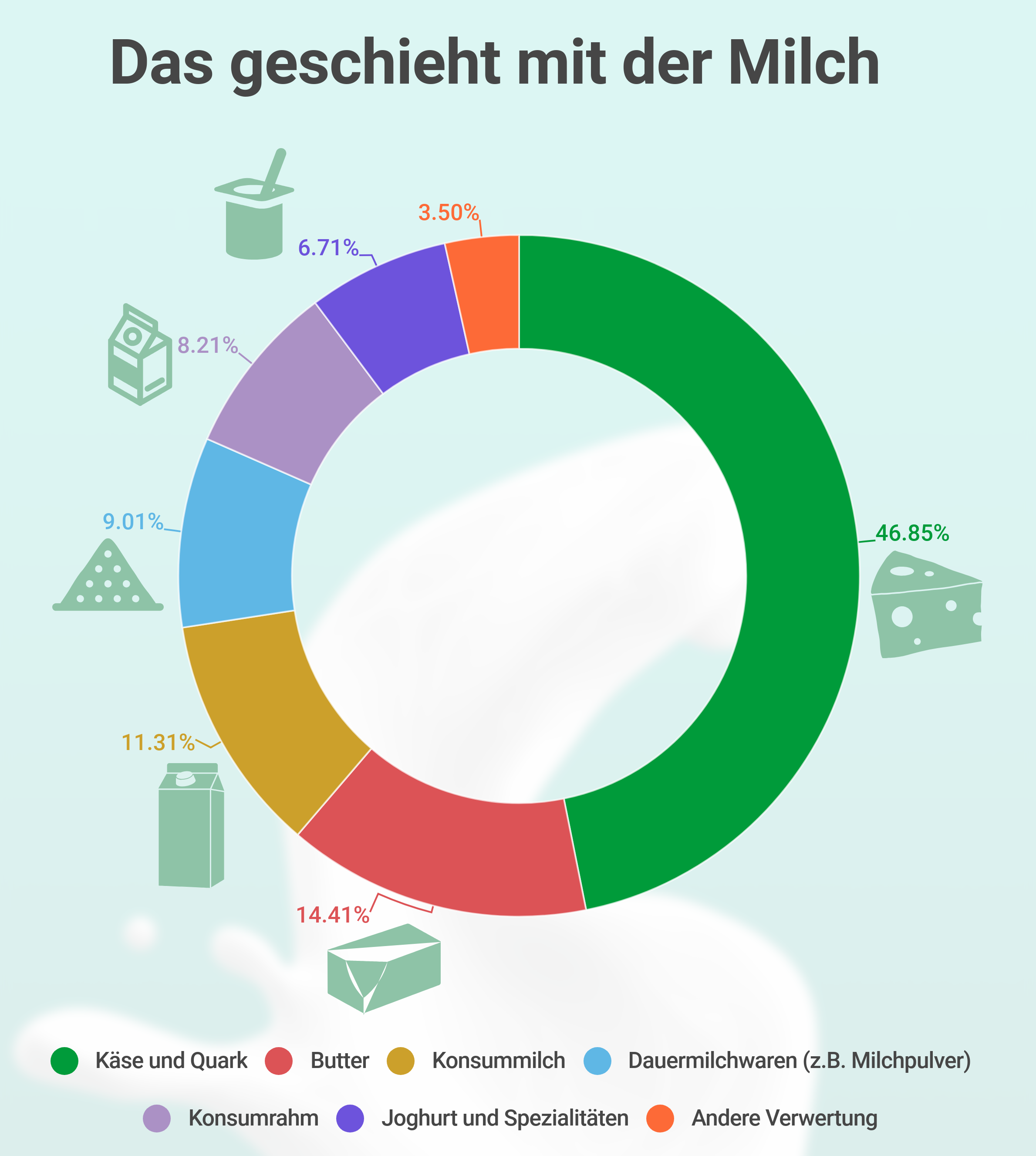 Im letzten Jahr wurden in der Schweiz 546'479 Kühe von insgesamt 24'351 Kuhhalter*innen gemolken. Daraus resultierte eine Milchproduktion von total 3.8 Millionen Tonnen. Davon gelangten 3.4 Millionen Tonnen in den Markt, 0.37 Millionen Tonnen wurden als Fütterungsmilch und 0.03 Millionen Tonnen als Haushaltsmilch verwendet. Fast die Hälfte (46.8 %) der Verkehrsmilch wurde zu Käse und Quark verarbeitet.