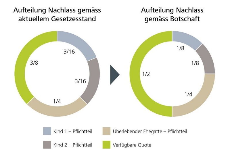 Die wesentlichste Änderung betrifft die Pflichtteile – das sind die Anteile am Erbe, auf die Kinder, Ehegatten oder Eltern heute Anspruch haben. Der Pflichtteil für die Kinder wird reduziert, derjenige für die Eltern fällt vollständig weg. Dadurch wird die freie Quote für den Erblasser erhöht. Er hat somit eine grössere Freiheit, den Nachlass zu verteilen.