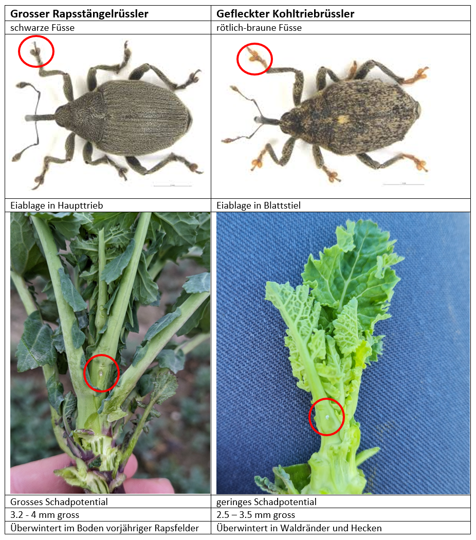 Bald steigen die Temperaturen über 10 °C und es ist mit dem Einflug des Grossen Rapsstängelrüsslers zu rechnen. Der Pflanzenschutzdienst beginnt in Kürze mit der Überwachung dieses Schädlings. Zeitgleich fliegt auch der ähnlich aussehnende Gefleckte Kohltriebrüssler in die Bestände ein. Das Schadpotential des Grossen Rapsstängelrüssler ist deutlich höher als das des Gefleckten Kohltriebrüsslers.