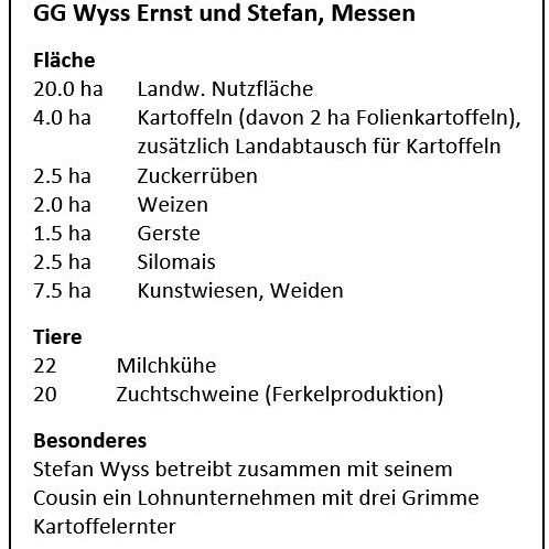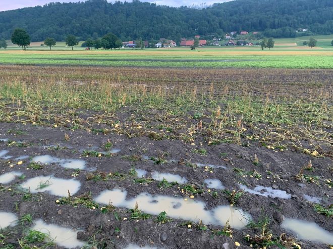 Doch nicht nur der Hagel vom 28. Juni ist für die Kulturschäden verantwortlich. Hinzu kamen Unmengen an Regen, welche die Limpach (Bach) seither bereits zweimal über die Ufer treten liessen. Der hohe Wasserstand beeinträchtigte zudem die Funktion der Drainagesysteme. «Das Wasser wird in die Felder zurückgedrückt», so Wyss. Folglich stehen auch zu jetzigem Zeitpunkt viele Teile des Kulturlandes unter Wasser. Stefan Wyss ist froh, seine Kulturen gegen Hagel abgesichert zu haben. Die Schadenabschätzung durch den Experten fand in den letzten Tagen statt. «Beim Mais wurden 100 % Ertragsausfall geschätzt», so Wyss, und weiter: «Bei den Zuckerrüben sind es 90-100 %, bei der Gerste 95 %. Etwas schwieriger Einzuschätzen ist der Ausfall bei den Kartoffeln. Dieser dürfte aber auch 80 % betragen. Knollen, die länger als einen halben Tag unter Wasser standen, werden allesamt verfault sein.» Wyss betont weiter, dass der durch den Hagel verursachte starke Blattverlust dazu führt, dass die Kartoffelknollen und die Zuckerrübenwurzeln Energiereserven für die Neubildung von Blattmasse freisetzen, wodurch sich die Zucker- bzw. die Stärkegehalte in den Knollen und Wurzeln verringern. Nebst dem Ertrag leidet somit auch die Qualität. «Man kann sagen, dass es den Weizen und das Gras am wenigsten stark getroffen hat», erklärt Wyss abschliessend über das Schadenausmass.