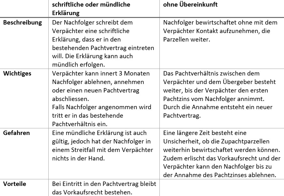 Bei der Betriebsübernahme bestehen drei mögliche Varianten, die Zupachtparzellen von Dritten weiter zu bewirtschaften. Welche drei Varianten möglich sind und was es dabei zu beachten gibt, ist in der folgenden Tabelle aufgelistet:
