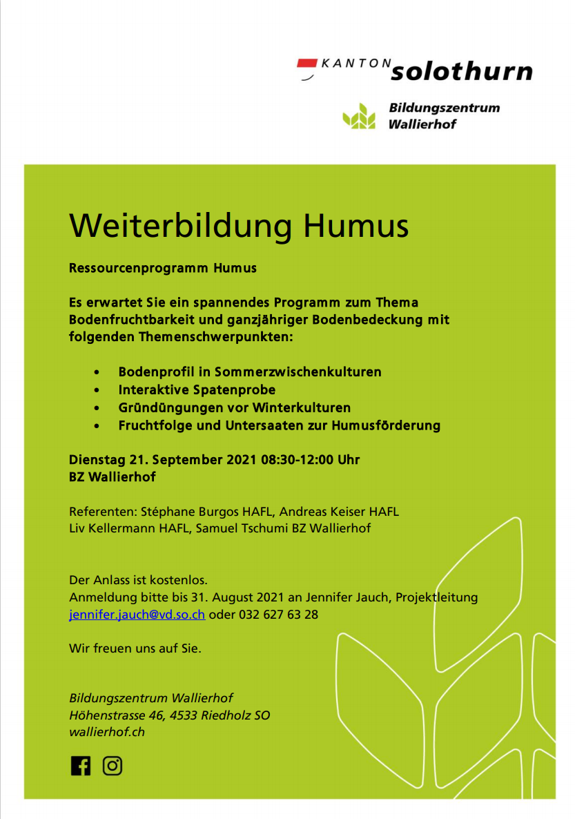 Im Rahmen des Ressourcenprogramms Humus findet im September ein Weiterbildungsanlass zum Thema Bodenfruchtbarkeit und ganzjährige Bodenbedeckung statt. Dabei werden wir uns einen halben Tag mit den Themen Boden, Gründüngung, Untersaat und Fruchtfolge auseinandersetzten. Zudem haben wir die Möglichkeit die Spatenprobe wieder einmal vertieft zu üben.