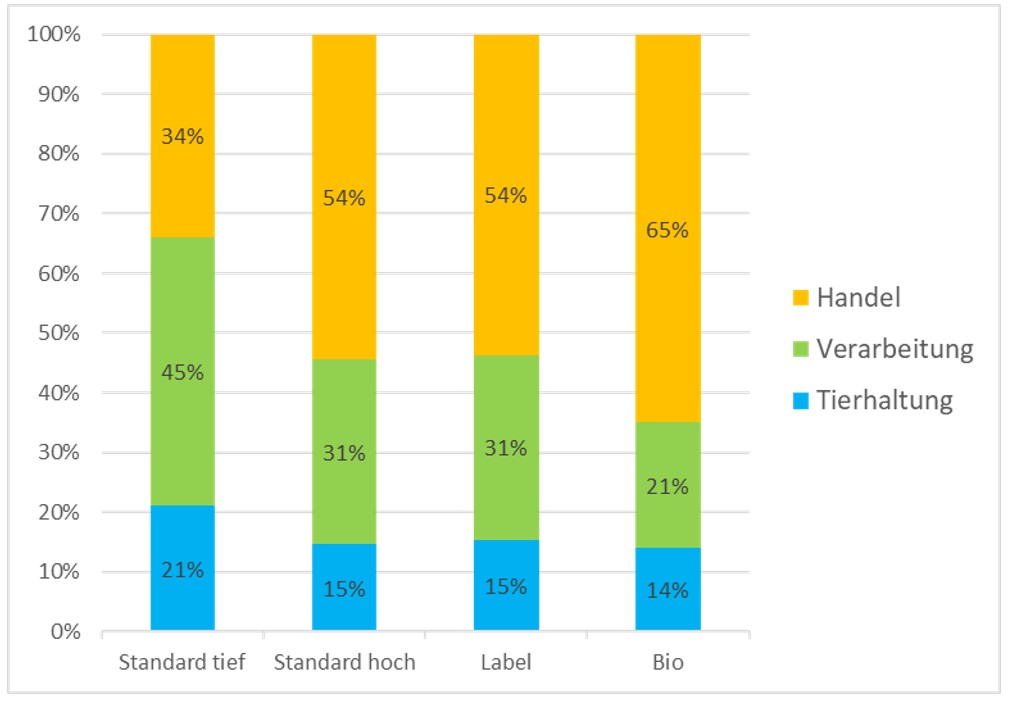 Wirtschaftlich überleben können die Schweizer Landwirtschaft eigentlich nur aufgrund des Grenzschutzes und der Direktzahlungen, welche der Agrarpolitik zu verdanken seien, so Binswanger. Der Grundstein für die Agrarpolitik wurde während des ersten Weltkriegs und in den Folgejahren gelegt, als eine Hungersnot in der Schweiz herrschte. Binswanger zeigte auch auf, dass die Landwirtschaft am Markt bessere Produktepreise erwirken müsse. Der Konsumentenpreis für Nahrungsmittel und der Produzentenpreis klaffe immer weiter auseinander und der Anteil der Landwirtschaft am Konsumentenfranken betrage nur noch rund einen Drittel. Ein wichtiger Grund für diese negative Entwicklung sei die Marktmacht des Lebensmitteldetailhandels. Binswangers jüngste Studie im Bereich des Labelfleischmarkts hat aufgezeigt, dass der Anteil der Wertschöpfung vor allem beim Handel ansteigt, je höher der Produktestandart ist. Am Beispiel von Hinterschinken vom Schwein (siehe Abbildung) wurde festgestellt, dass der Handel beim tiefen Standard rund ein Drittel der Wertschöpfung für sich beansprucht und der Landwirtschaft 20% bleibt. Der andere Teil, 45% der Wertschöpfung bleibt beim Verarbeiter. Beim Biostandart bleiben gerade nur noch 14% beim Landwirt während der Handel satte 65% der Wertschöpfung für sich beansprucht und die restlichen 21% der Verarbeiter einstreicht. Diese Tatsache sei ein Hauptgrund dafür, warum der Labelmarkt nicht stärker wachse; die unverhältnismässige Abschöpfung von Verarbeiter und Handle führe zu sehr hohen Preisen im Premiumsegment und der tiefe Wertschöpfungsanteil bei den Produzenten animiere nicht zur Ausdehnung der Produktion. Hier sei die Wettbewerbskommission gefragt, damit dieser Missstand korrigiert werden könne, erklärte Binswanger.