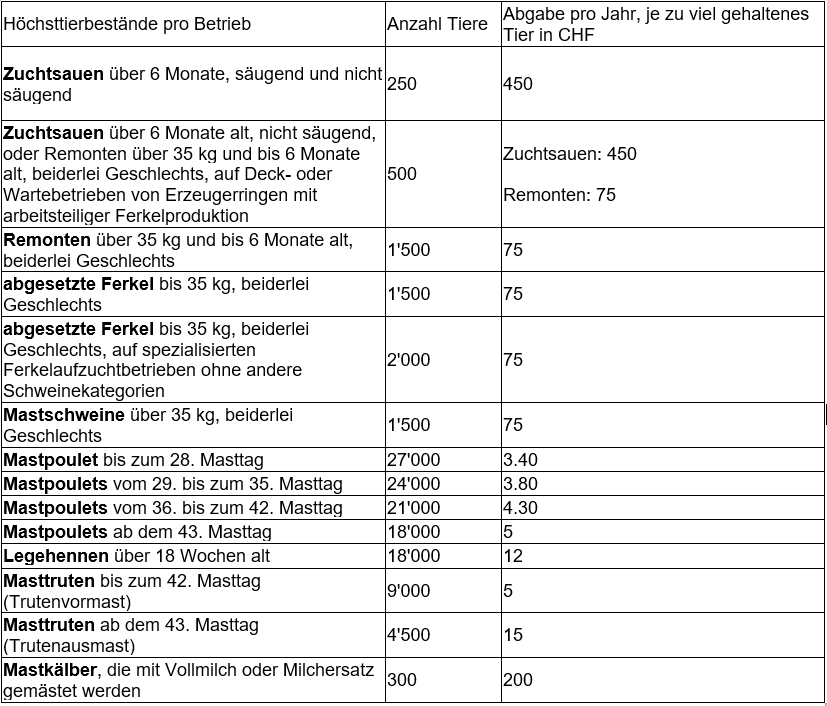 Die Höchstbestandesverordnung wurde im Rahmen der Agrarpolitik 2002 im Landwirtschaftsgesetz verankert. Darin sind Höchstbestände je Betrieb für die Schweinezucht, Schweinemast, Legehennenhaltung, Pouletmast, Trutenmast und Kälbermast festgelegt. Bei einer Überschreitung dieser Höchstbestände erhebt das Bundesamt für Landwirtschaft bei den Bewirtschafterinnen und Bewirtschaftern Abgaben pro zu viel gehaltenes Tier (siehe Tabelle 1). Die Höhe der Abgaben ist so festgelegt, dass sich das Halten von zusätzlichen Tieren wirtschaftlich nicht lohnt. Werden auf einem Betrieb verschiedene Nutztierarten gehalten, so darf die Summe der einzelnen prozentualen Anteile an den jeweiligen Höchstbeständen 100 Prozent nicht überschreiten. (Quelle: Bundesamt für Landwirtschaft)